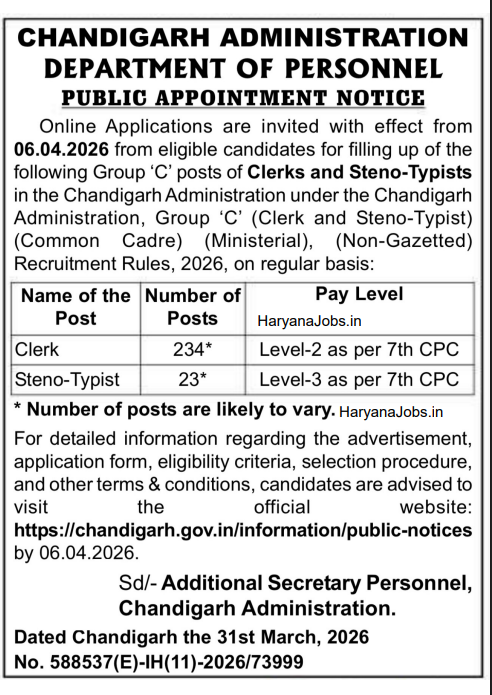 Chandigarh Administration Clerk & Typist Recruitment 2026:: The Chandigarh Administration has released an official notification for the recruitment of Clerk and Steno-Typist posts under Group āCā category. This recruitment will be conducted under the Ministerial (Non-Gazetted) Common Cadre Recruitment Rules, 2026. Eligible candidates can apply online through the official website starting from 06 April 2026.