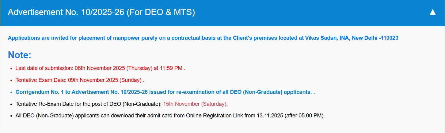 The online registration process is open, and the last date to apply is 6th November 2025, while the CBT/Typing Test is scheduled on 9th November 2025 at various centres in Delhi. Admit cards will be available on the portal and via email 2 days before the exam.