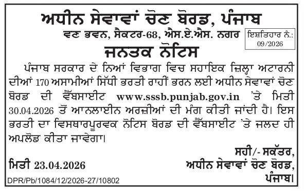 The official notification (Advt. No. 09/2026) was released on 23 April 2026, and candidates can apply online through the official website sssb.punjab.gov.in. Interested candidates are advised to check all eligibility criteria and apply before the last date.