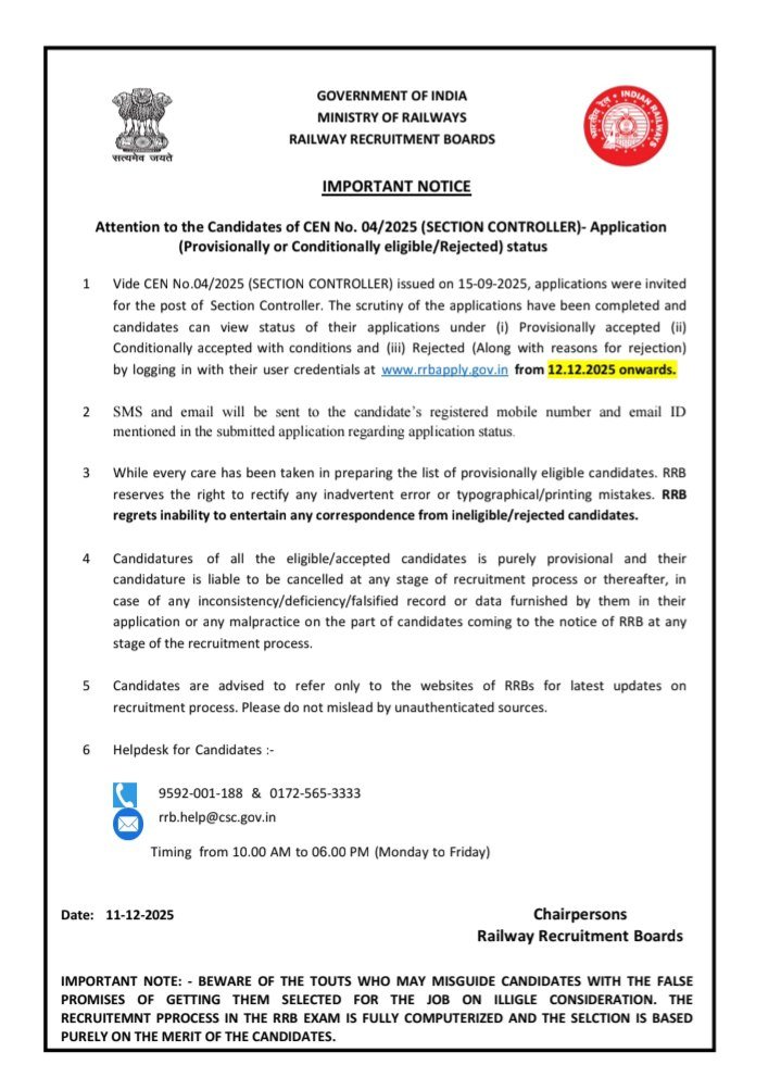 RRB Section Controller Recruitment 2025: Application Status Out, Check Now