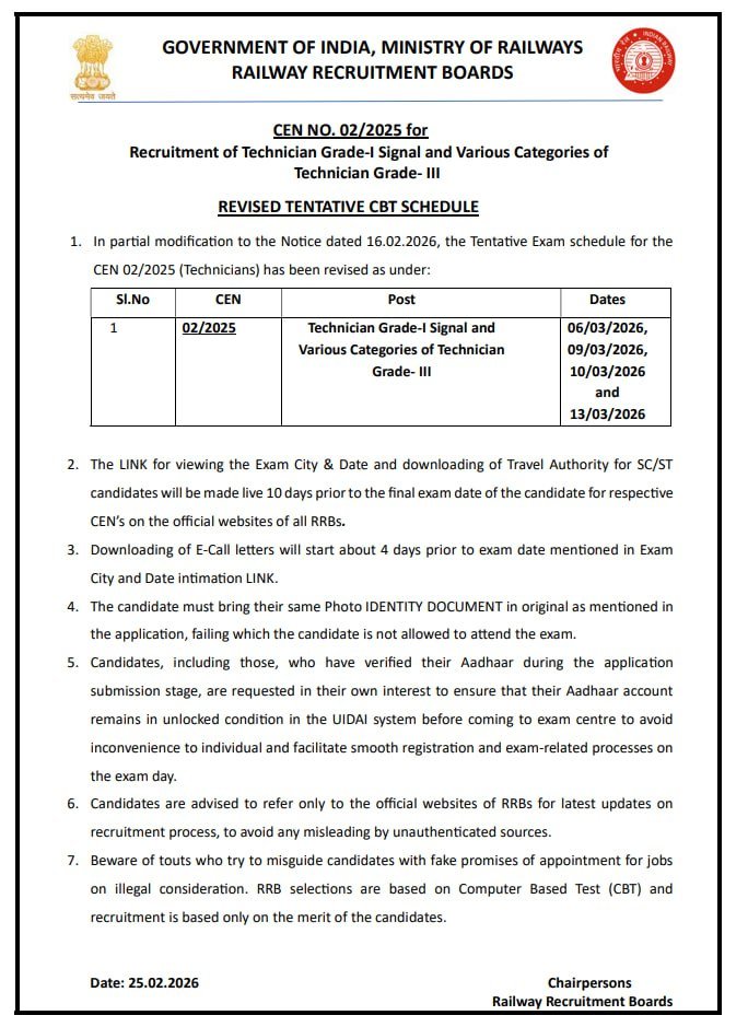 RRB Technician Recruitment 2025: Railway Recruitment Boards (RRBs) have released an indicative notice for the recruitment of Technicians Grade I Signal and Grade III under the Centralised Employment Notification (CEN) No. 02/2025. This recruitment drive is open to eligible Indian citizens willing to serve in various zones across Indian Railways. The application window will open on 28 June 2025 and close on 07 August 2025.