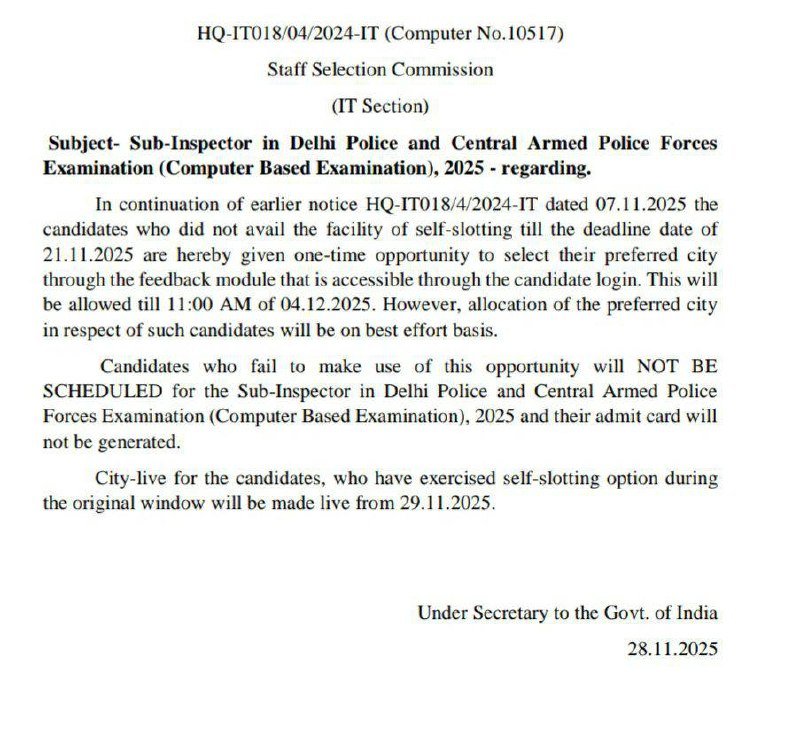 | SSC CPO 2025 City Intimation and Self Slot Notice | Notice |