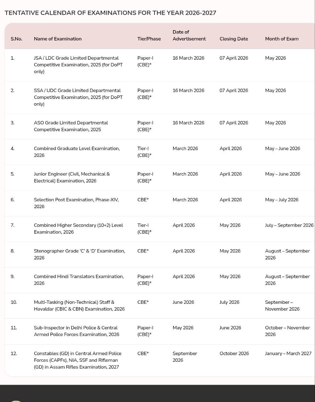 Candidates are advised to track notification dates and exam months carefully to plan their preparation strategy in advance.The Staff Selection Commission (SSC) has officially published the tentative examination schedule for the year 2026–27, outlining important recruitment exams for graduates, 10+2 candidates, matric-level posts, technical and non-technical positions. As per the calendar, application notifications will begin from March 2026, while most examinations will be held between May 2026 and March 2027. Exams like SSC CGL, CHSL, JE, MTS, CPO, GD Constable, Stenographer, and Selection Post will be conducted in Computer Based Test (CBT/CBE) mode. Candidates are advised to track notification dates and exam months carefully to plan their preparation strategy in advance.