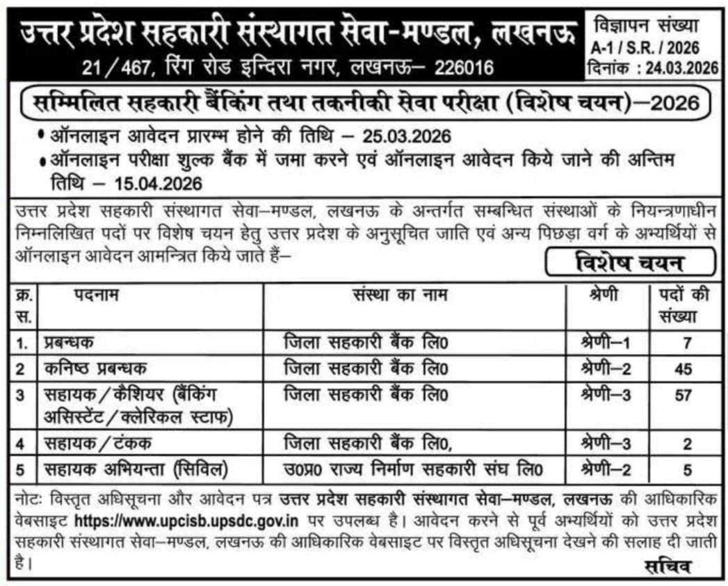 UP Cooperative Bank Recruitment 2026: The Uttar Pradesh Cooperative Bank has released the UP Cooperative Bank Recruitment 2026 notification for 116 posts. The online application process will start from 25 March 2026 and continue till 15 April 2026. Candidates interested in banking sector jobs can apply online through the official website within the given dates. This recruitment offers a great opportunity for eligible candidates seeking government jobs in Uttar Pradesh. Applicants are advised to check eligibility criteria, age limit, and other details before applying online.